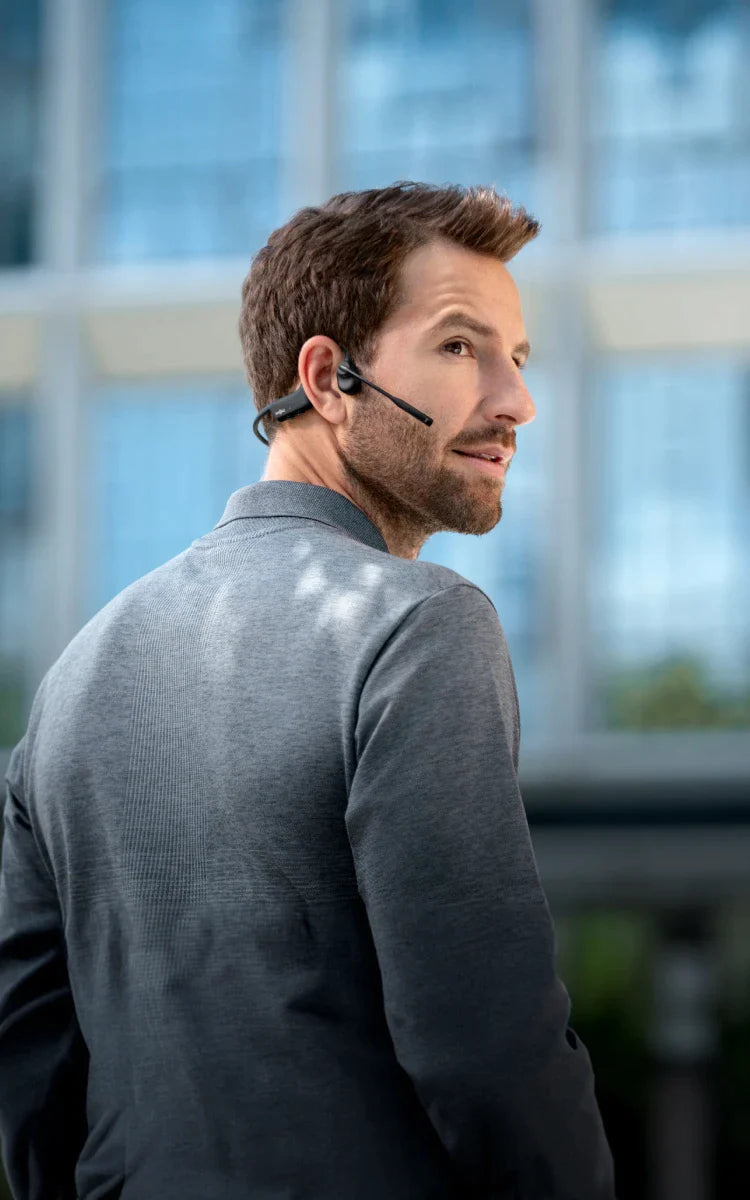 Unlike traditional headsets that cover your ears and cut you off from your surroundings, OpenComm2's open-ear design keeps you connected to the world without compromising on comfort or audio quality.